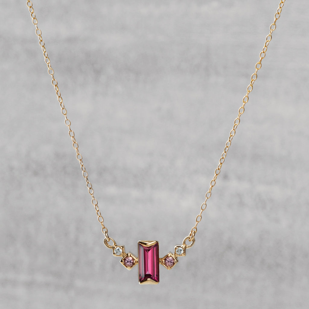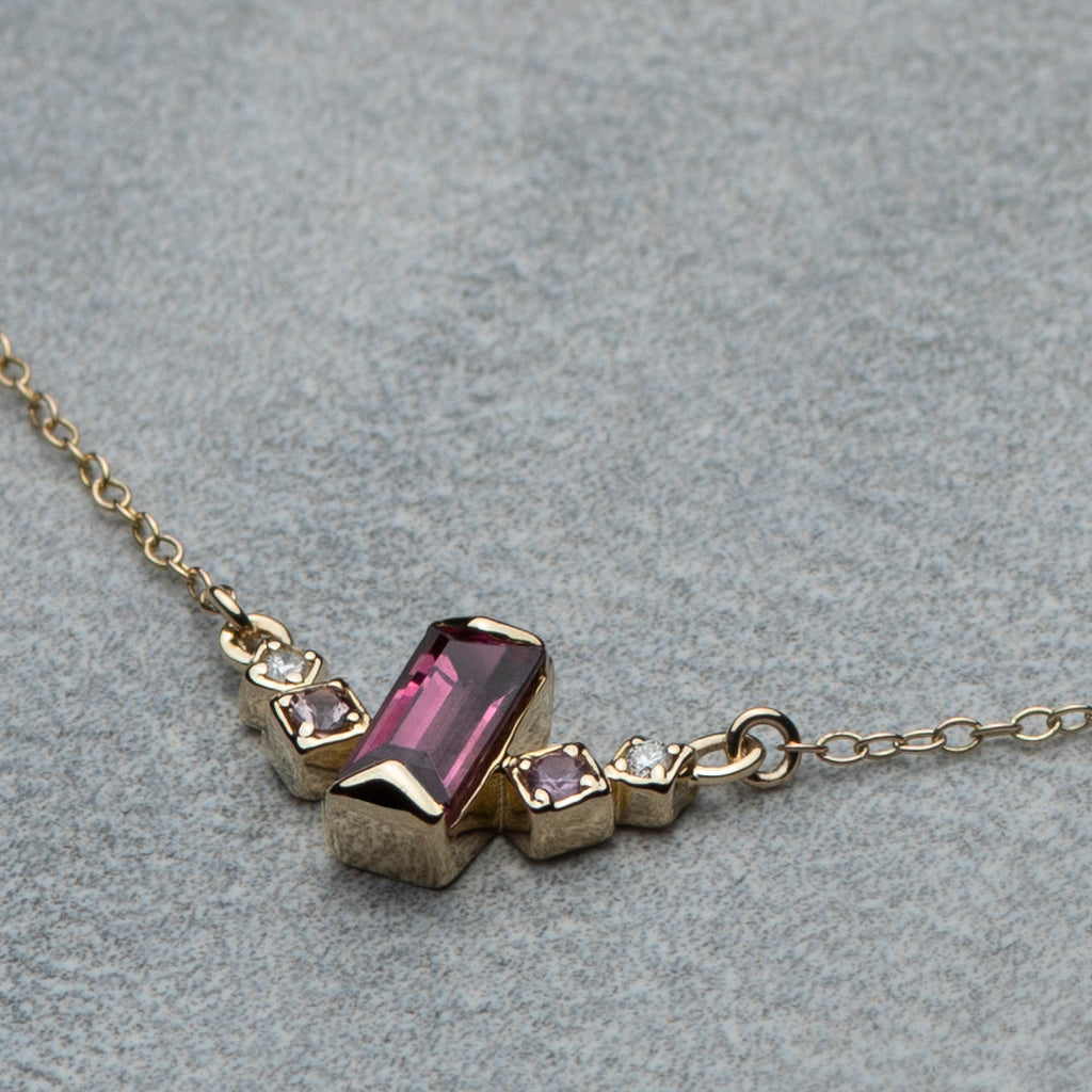 The Apex Necklace is a spectrum of twilight pink. A blend of gemstones hand-selected for their rarity, beauty and meaning. A captivating piece to remind you of your inner strength (rhodolite garnet), intuition & wisdom (pink sapphire) and love (diamond).
