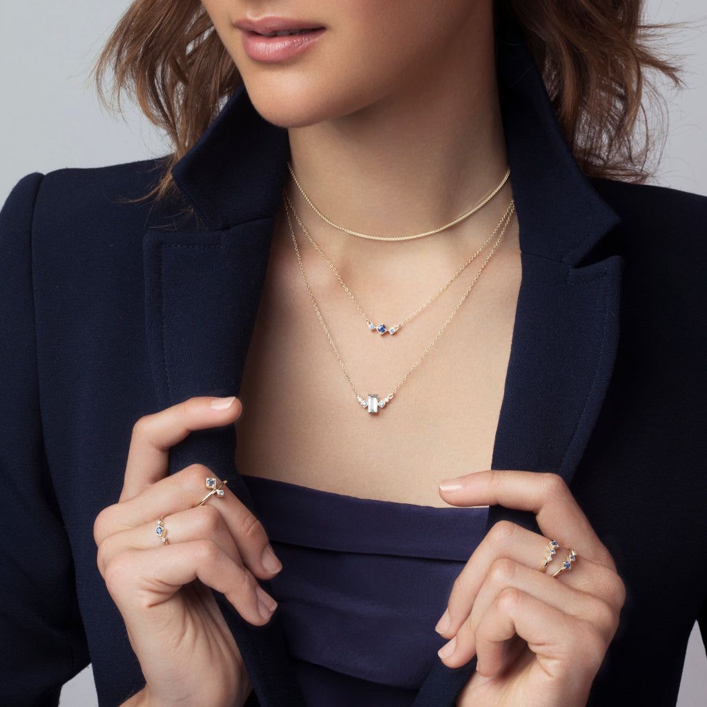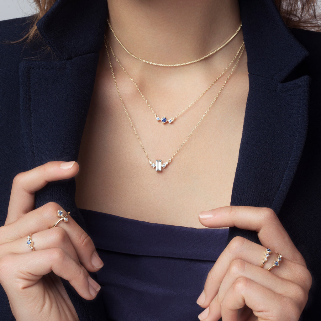 The Apex Necklace is a spectrum of daybreak blue. A blend of gemstones hand-selected for their rarity, beauty and meaning. An uplifting piece that evokes love & loyalty (sky blue topaz), wisdom & hope (blue sapphire) and re-engages your power & strength (diamond).