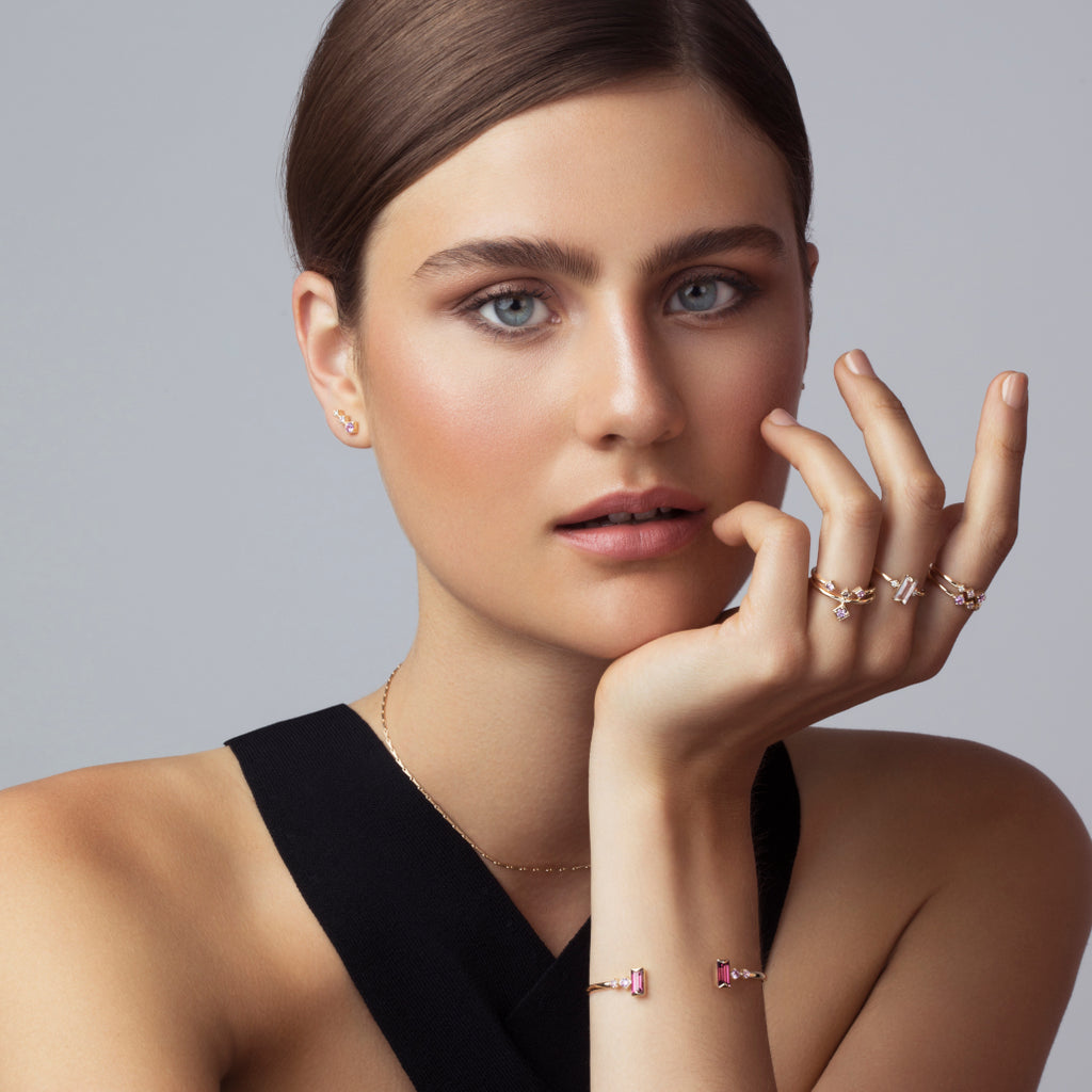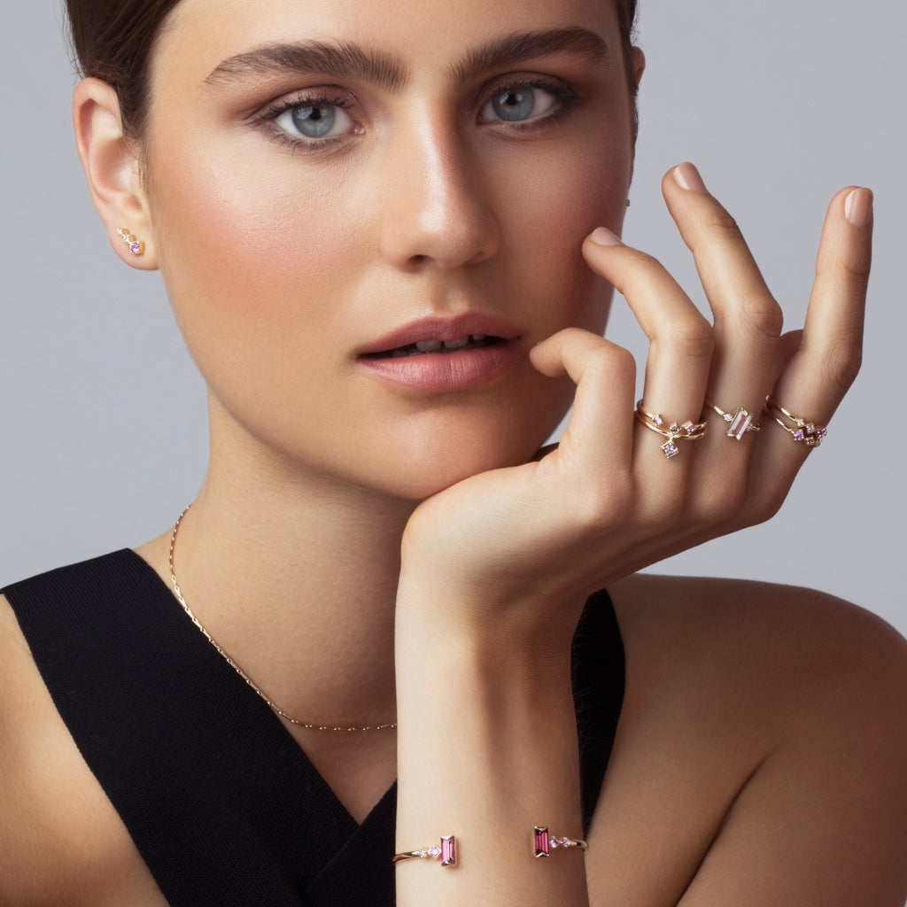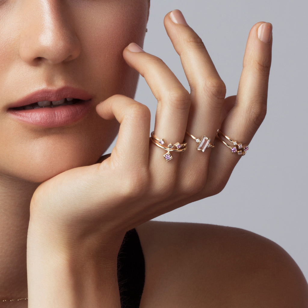 The Open Ring is a shimmer of dusk pink, showcasing gemstones which have been hand-selected for their rarity, beauty and meaning. A captivating piece, it evokes love, intuition & wisdom (pink sapphire).