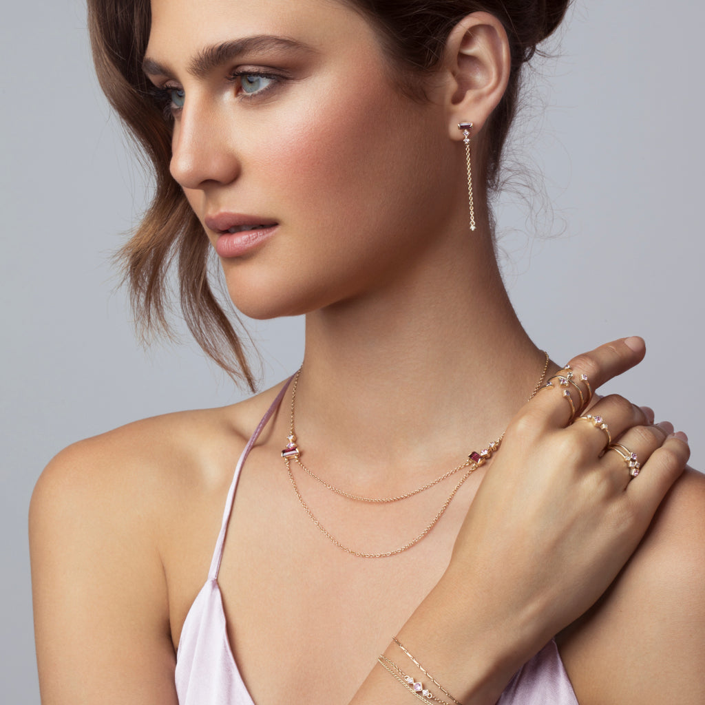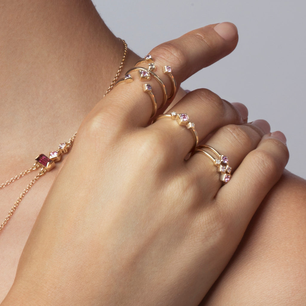 The Open Ring is a shimmer of twilight pink, showcasing gemstones which have been hand-selected for their rarity, beauty and meaning. An enchanting piece, it evokes love, intuition & wisdom (pink sapphire).